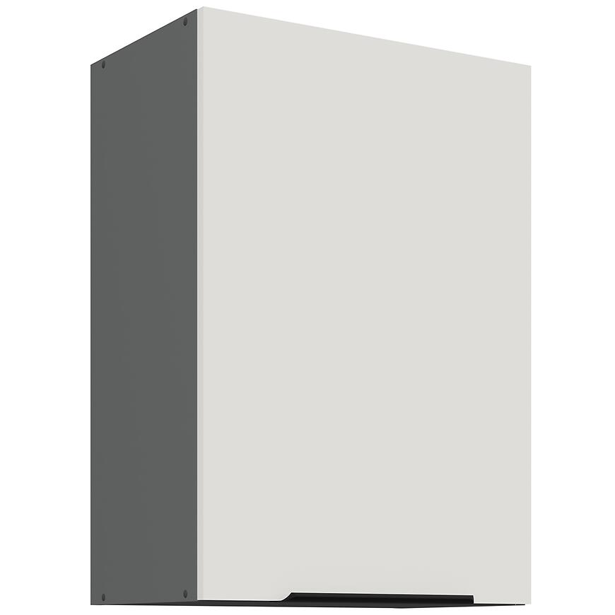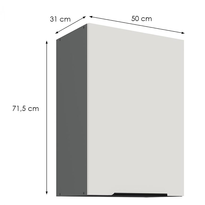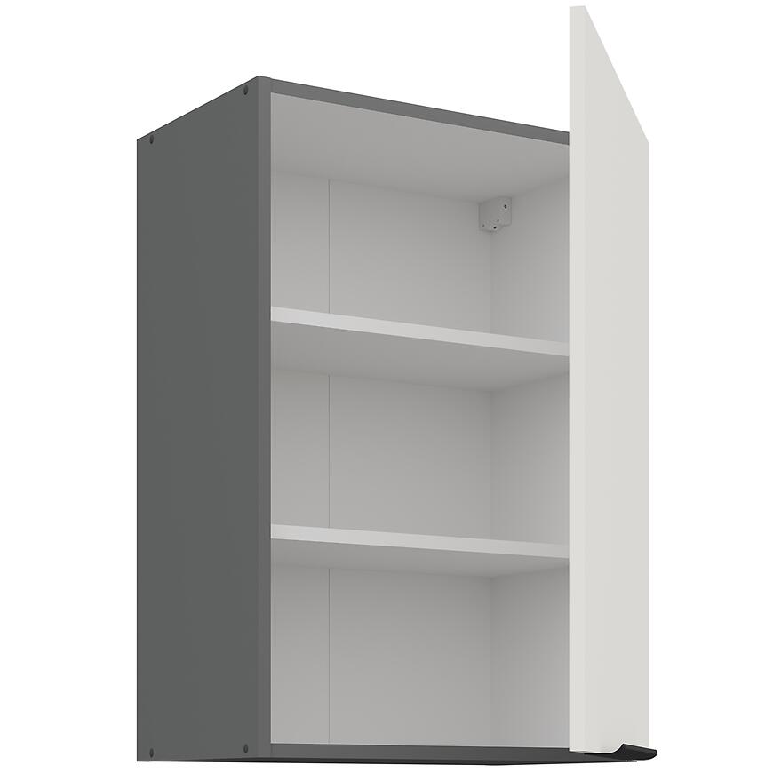 Korpus szafki utrzymano w eleganckiej szarości, dzięki czemu całość tworzy spójne połączenie z białymi frontami. Konstrukcja z solidnej, laminowanej płyty wiórowej zapewnia stabilność oraz wytrzymałość na obciążenia typowe dla szafek kuchennych górnych. Matowe wykończenie korpusu idealnie komponuje się z frontami, tworząc estetyczną, nowoczesną formę, która znakomicie wpisuje się w jasne i ciemniejsze aranżacje wnętrz.