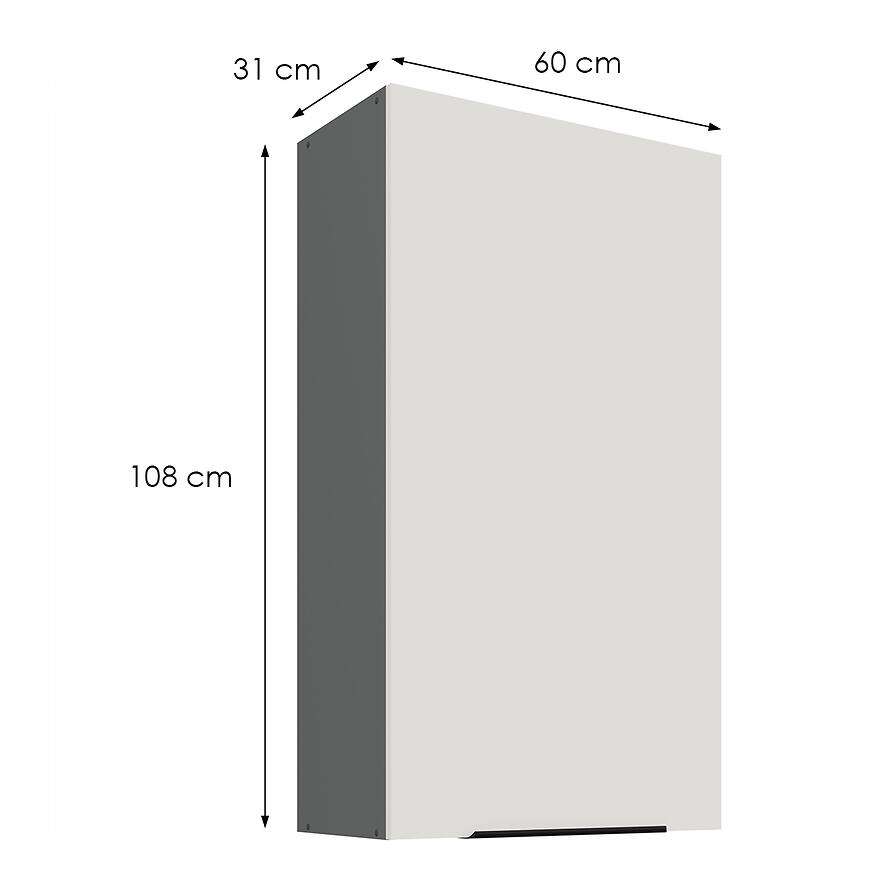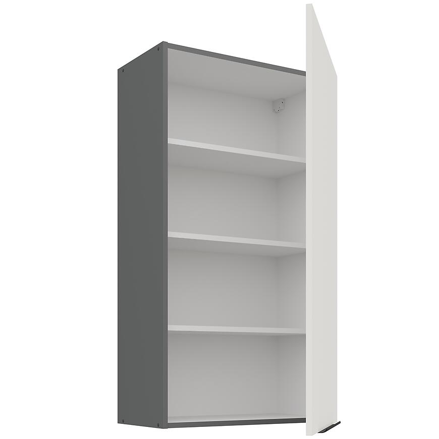 Korpus szafki utrzymano w eleganckiej szarości, dzięki czemu całość tworzy spójne połączenie z białymi frontami. Konstrukcja z solidnej, laminowanej płyty wiórowej zapewnia stabilność oraz wytrzymałość na obciążenia typowe dla szafek kuchennych górnych. Matowe wykończenie korpusu idealnie komponuje się z frontami, tworząc estetyczną, nowoczesną formę, która znakomicie wpisuje się w jasne i ciemniejsze aranżacje wnętrz.