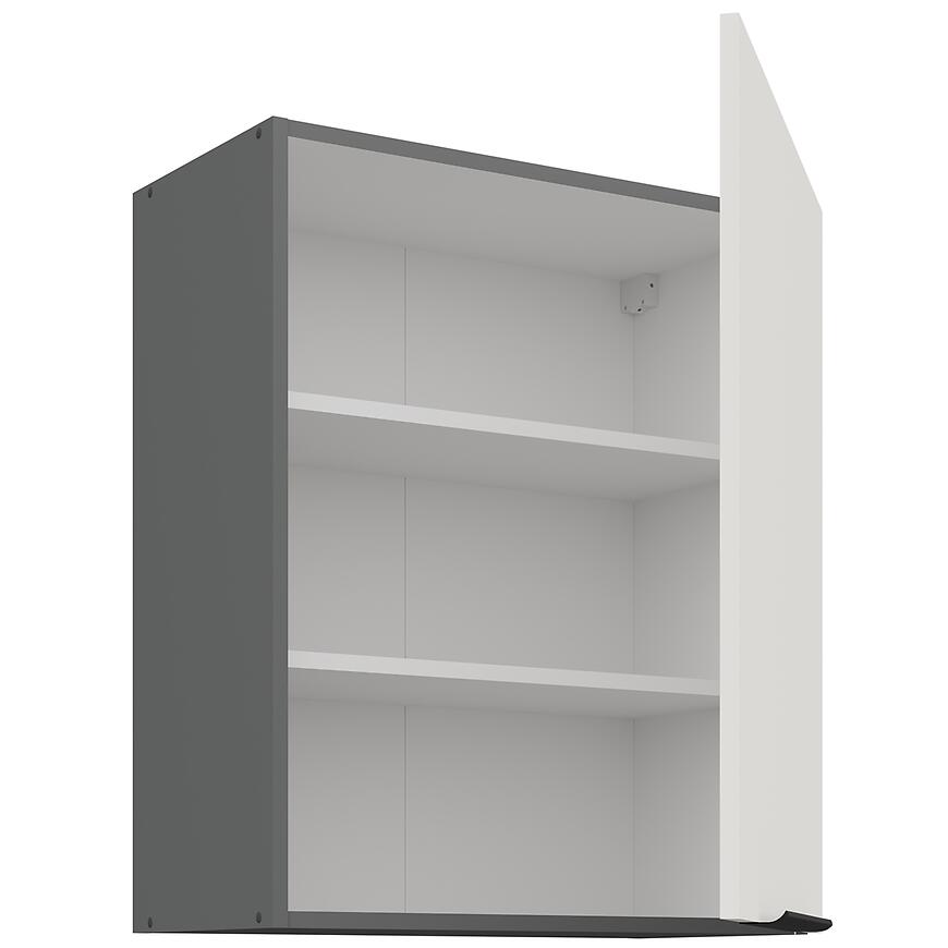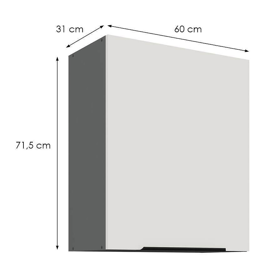 Korpus szafki utrzymano w eleganckiej szarości, dzięki czemu całość tworzy spójne połączenie z białymi frontami. Konstrukcja z solidnej, laminowanej płyty wiórowej zapewnia stabilność oraz wytrzymałość na obciążenia typowe dla szafek kuchennych górnych. Matowe wykończenie korpusu idealnie komponuje się z frontami, tworząc estetyczną, nowoczesną formę, która znakomicie wpisuje się w jasne i ciemniejsze aranżacje wnętrz.