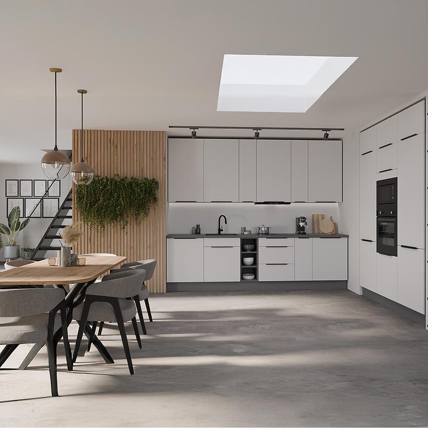 Model Aria-Wh/Ant Anti Fingerprint to mebel, który łączy dopracowany design, praktyczną konstrukcję i trwałość. Matowe fronty Crystal White AFM oraz antracytowy korpus tworzą elegancką całość, a mechanizm cichego domyku zwiększa komfort codziennego korzystania. Jest to propozycja odpowiednia do kuchni nowoczesnych, minimalistycznych i skandynawskich, w których liczy się harmonia, estetyka i wygoda użytkowania.