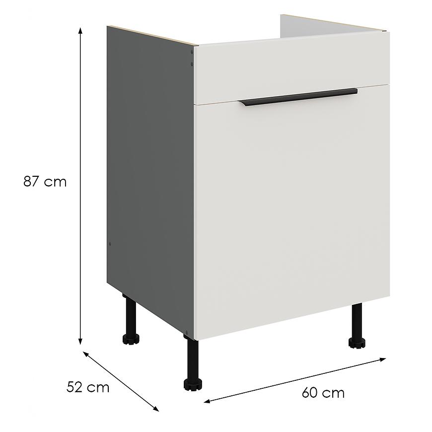 Szafka o wymiarach 87 × 60 × 52 cm oferuje praktyczną przestrzeń do przechowywania naczyń, garnków i artykułów spożywczych. Cichy domyk zwiększa komfort codziennego użytkowania i chroni fronty przed uderzeniami.