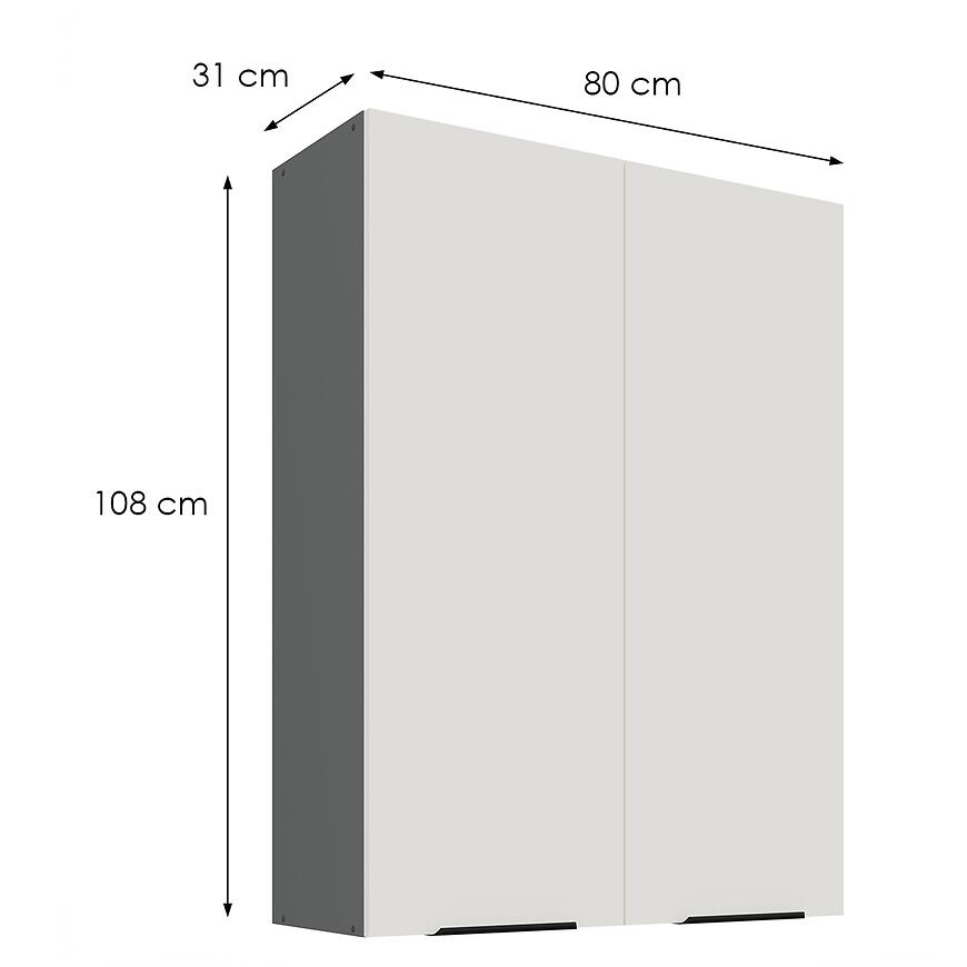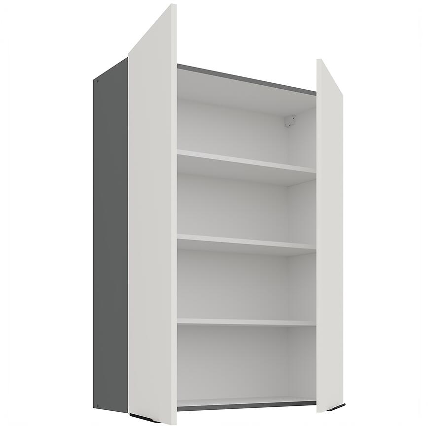 Korpus szafki utrzymano w eleganckiej szarości, dzięki czemu całość tworzy spójne połączenie z białymi frontami. Konstrukcja z solidnej, laminowanej płyty wiórowej zapewnia stabilność oraz wytrzymałość na obciążenia typowe dla szafek kuchennych górnych. Matowe wykończenie korpusu idealnie komponuje się z frontami, tworząc estetyczną, nowoczesną formę, która znakomicie wpisuje się w jasne i ciemniejsze aranżacje wnętrz.