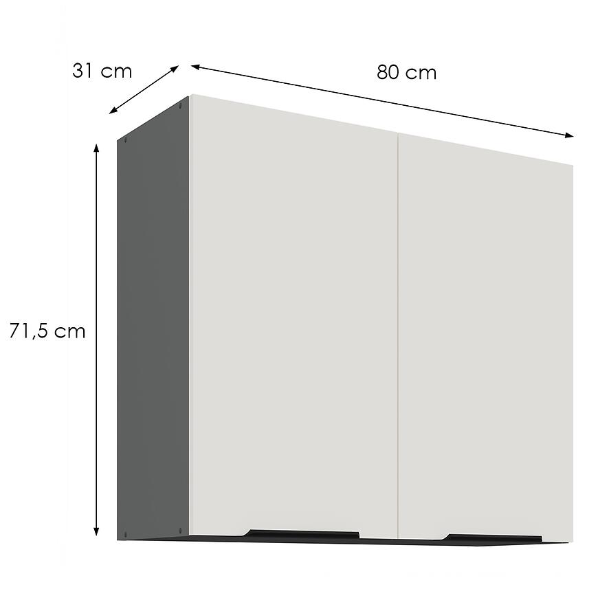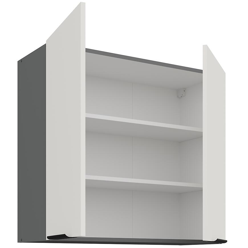 Korpus szafki utrzymano w eleganckiej szarości, dzięki czemu całość tworzy spójne połączenie z białymi frontami. Konstrukcja z solidnej, laminowanej płyty wiórowej zapewnia stabilność oraz wytrzymałość na obciążenia typowe dla szafek kuchennych górnych. Matowe wykończenie korpusu idealnie komponuje się z frontami, tworząc estetyczną, nowoczesną formę, która znakomicie wpisuje się w jasne i ciemniejsze aranżacje wnętrz.