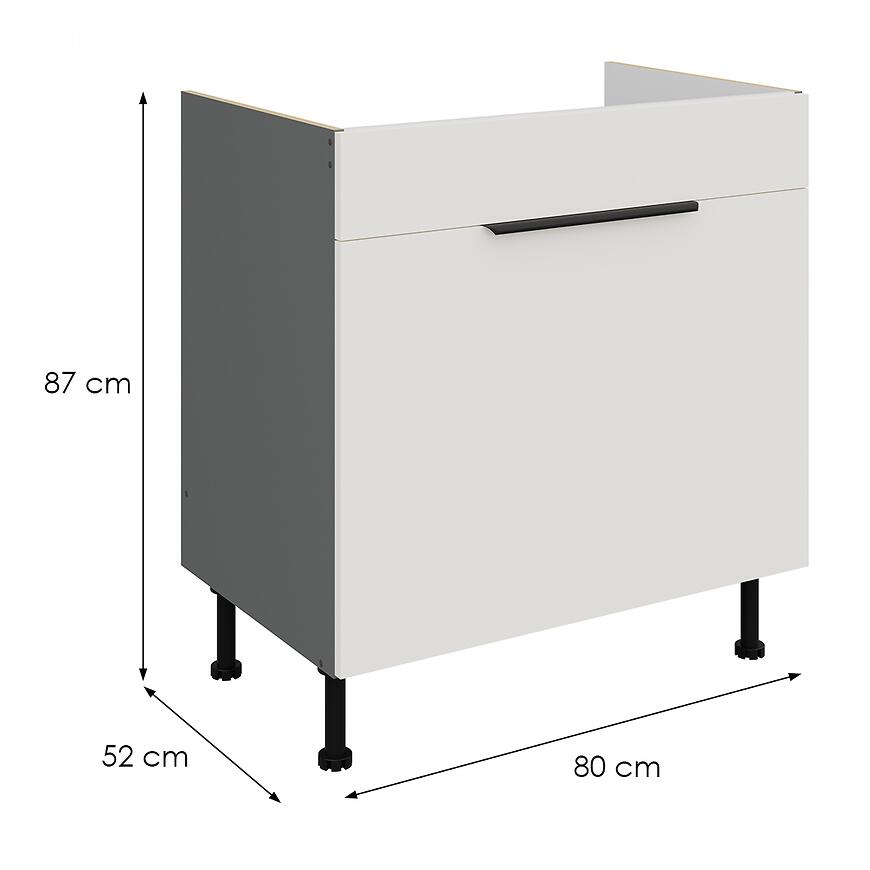 Szafka o wymiarach 87 × 80 × 52 cm oferuje przestronną dolną część do przechowywania garnków, naczyń i artykułów spożywczych. Cichy domyk zwiększa komfort codziennego użytkowania i chroni fronty przed uderzeniami.