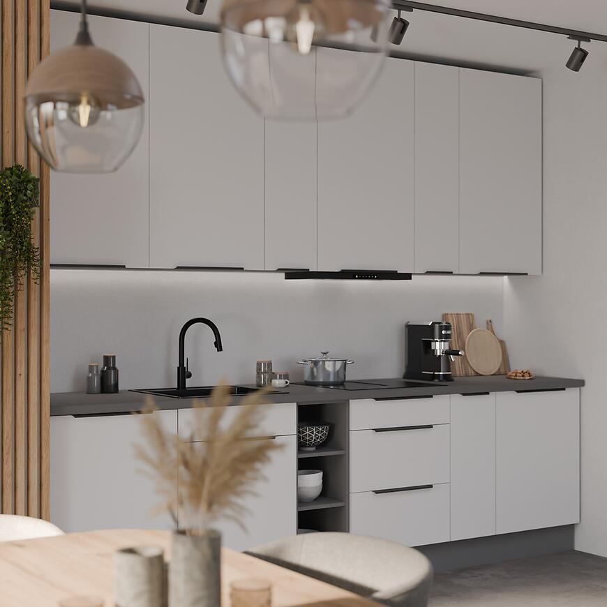 Fronty wykonano z płyty wiórowej laminowanej z powłoką anti-fingerprint, a korpus z płyty wiórowej laminowanej w matowym kolorze antracyt. Materiały zapewniają trwałość, odporność na codzienne użytkowanie i łatwość czyszczenia.
