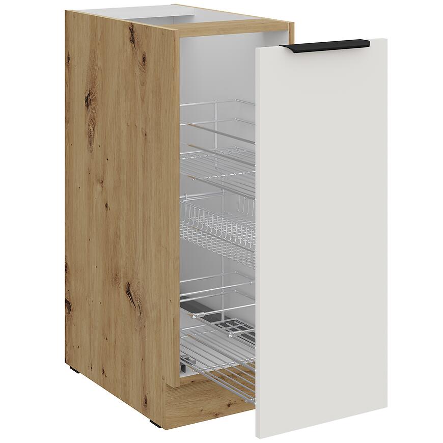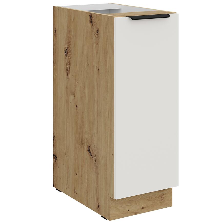 Korpus w wybarwieniu dąb artisan wprowadza naturalny, jasny akcent, a cokół w tym samym kolorze subtelnie wykańcza szafkę, podkreślając elegancję mebla. Matowe wykończenie frontów i korpusu nadaje szafce nowoczesny i stylowy charakter.