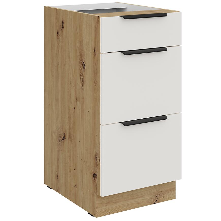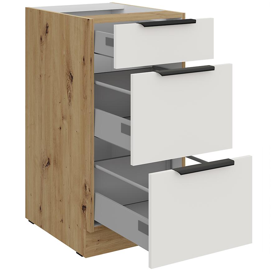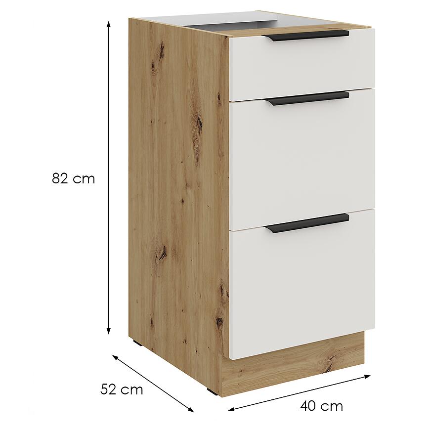 Szafka kuchenna Aria-Wh/Ar Anti Fingerprint 40d 3s Bb to kompaktowa, funkcjonalna szafka dolna o wymiarach 82 × 40 × 52 cm, łącząca nowoczesny design z wygodą użytkowania. Fronty w kolorze crystal white wykonano z laminowanej płyty wiórowej z matowym wykończeniem, co zapewnia odporność na odciski palców i łatwość utrzymania w czystości.