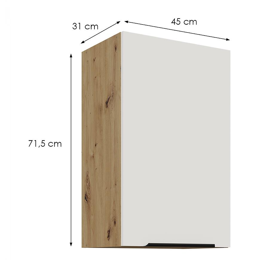 Zarówno fronty, jak i korpus wykonano z płyty wiórowej laminowanej, co zapewnia stabilność konstrukcji oraz odporność na obciążenia typowe dla szafek kuchennych górnych. Dzięki temu meble dobrze znoszą codzienne użytkowanie i pomagają utrzymać porządek w kuchni przez wiele lat. Materiały zastosowane w kolekcji Aria White pozwalają stworzyć kuchnię trwałą, estetyczną i łatwą do utrzymania w czystości.