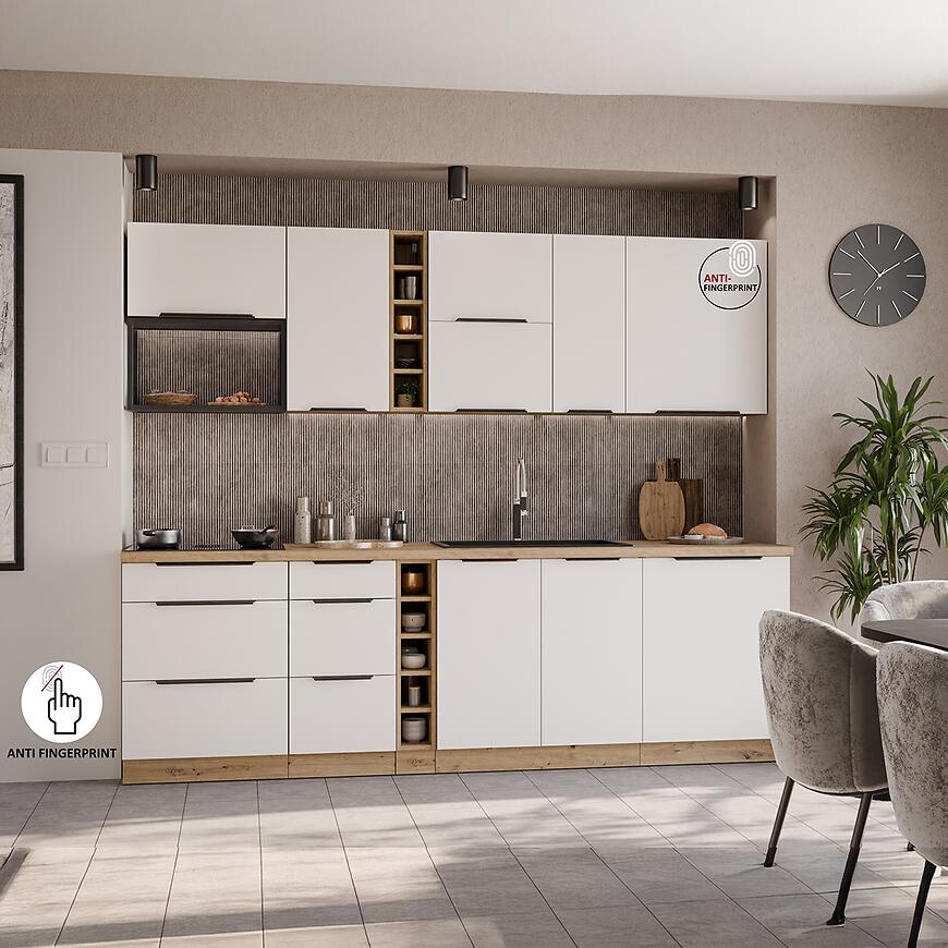 Fronty w kolorze Crystal White AFM zostały wykonane z płyty wiórowej laminowanej, co gwarantuje trwałość i odporność na codzienne użytkowanie. Ich matowe wykończenie sprawia, że powierzchnia prezentuje się efektownie, a jednocześnie jest łatwa w utrzymaniu. Górne fronty w białym wybarwieniu wprowadzają do wnętrza więcej światła i optycznie powiększają przestrzeń, co docenią użytkownicy zarówno dużych, jak i mniejszych kuchni. To rozwiązanie łączy estetykę i praktyczność, tworząc spójną kompozycję z jasnym korpusem.