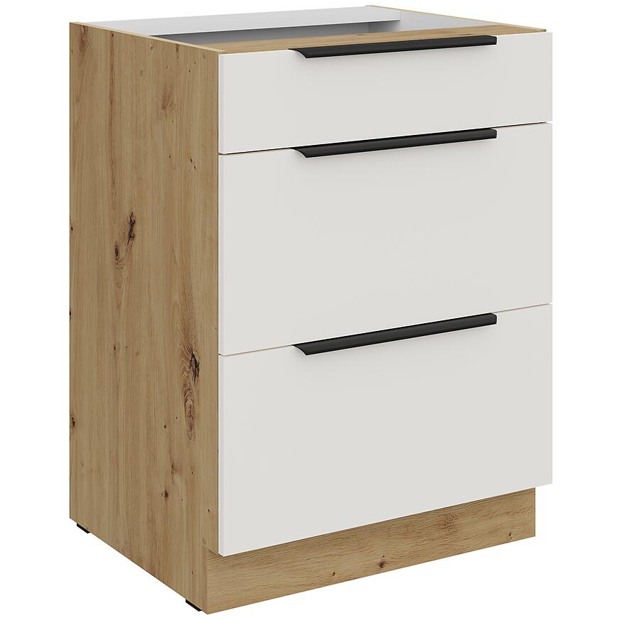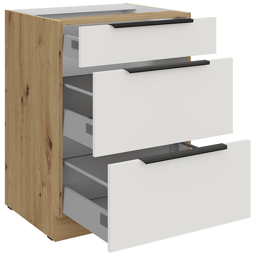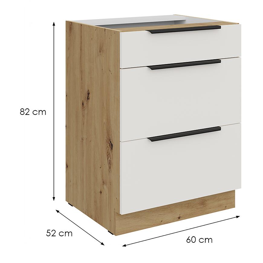 Szafka kuchenna Aria-Wh/Ar Anti Fingerprint 60d 3s Bb to przestronna szafka dolna o wymiarach 82 × 60 × 52 cm, łącząca nowoczesny design z funkcjonalnością. Fronty w kolorze crystal white wykonano z laminowanej płyty wiórowej z matowym wykończeniem, co zapewnia odporność na odciski palców i łatwość utrzymania w czystości.