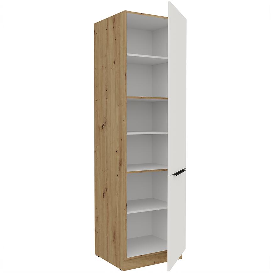 Model należy do kategorii szafek kuchennych kolumnowych i wymaga samodzielnego złożenia, co pozwala na dopasowanie do indywidualnego układu kuchni. Połączenie białego frontu z jasnym, drewnopodobnym korpusem tworzy spójną, elegancką aranżację wnętrza.