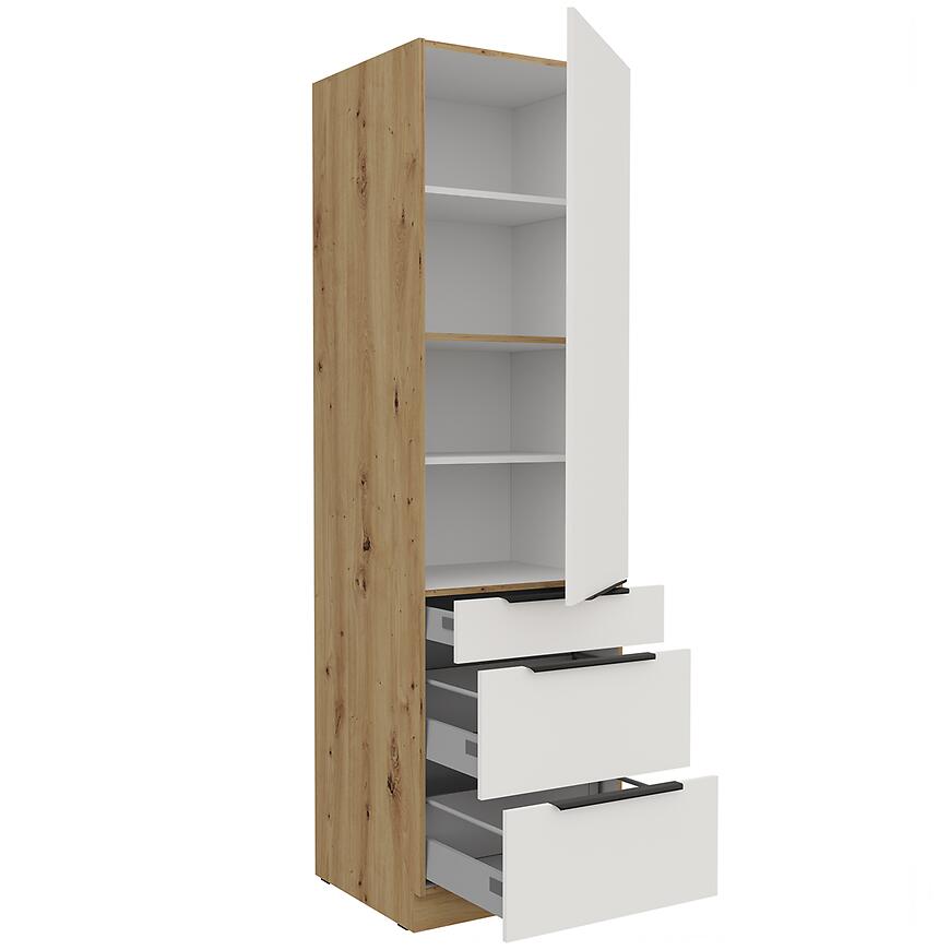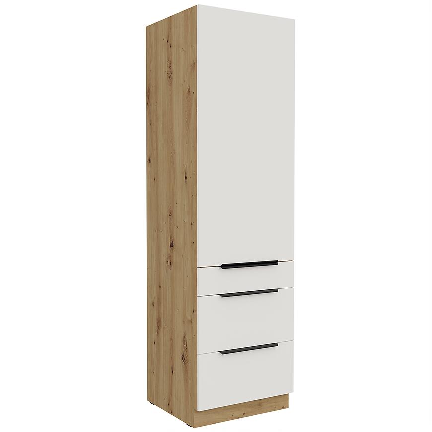 Model należy do kategorii szafek kuchennych kolumnowych i wymaga samodzielnego złożenia, co pozwala na dopasowanie do indywidualnego układu kuchni. Połączenie białych frontów z jasnym, drewnopodobnym korpusem wprowadza do kuchni elegancję, minimalizm i funkcjonalność w jednym.