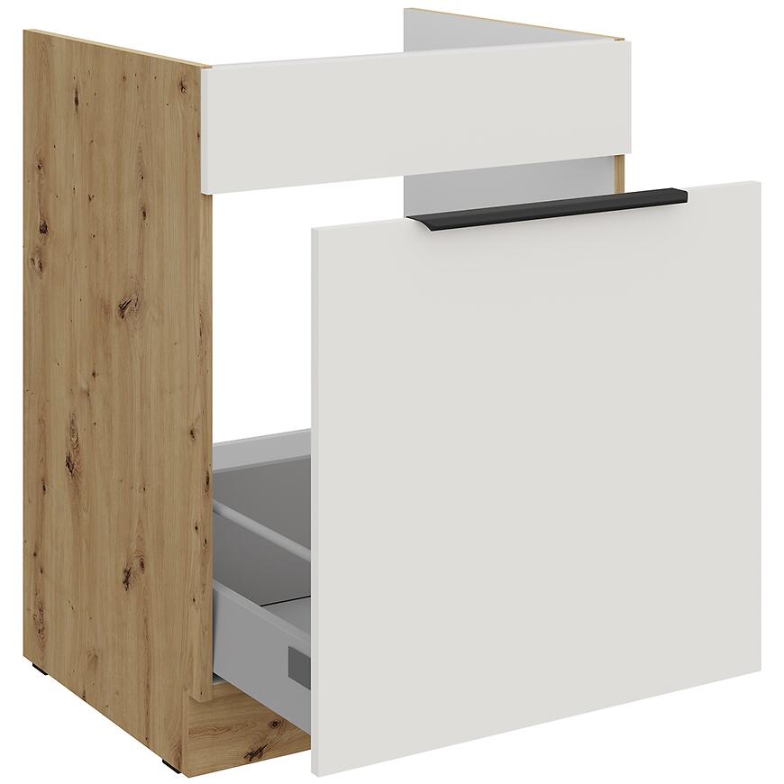 Korpus w wybarwieniu dąb artisan wprowadza naturalny, jasny akcent, a cokół w tym samym kolorze subtelnie dopełnia wygląd szafki, podkreślając spójność i elegancję całego mebla. Matowe wykończenie frontów i korpusu sprawia, że szafka prezentuje się nowocześnie i subtelnie.