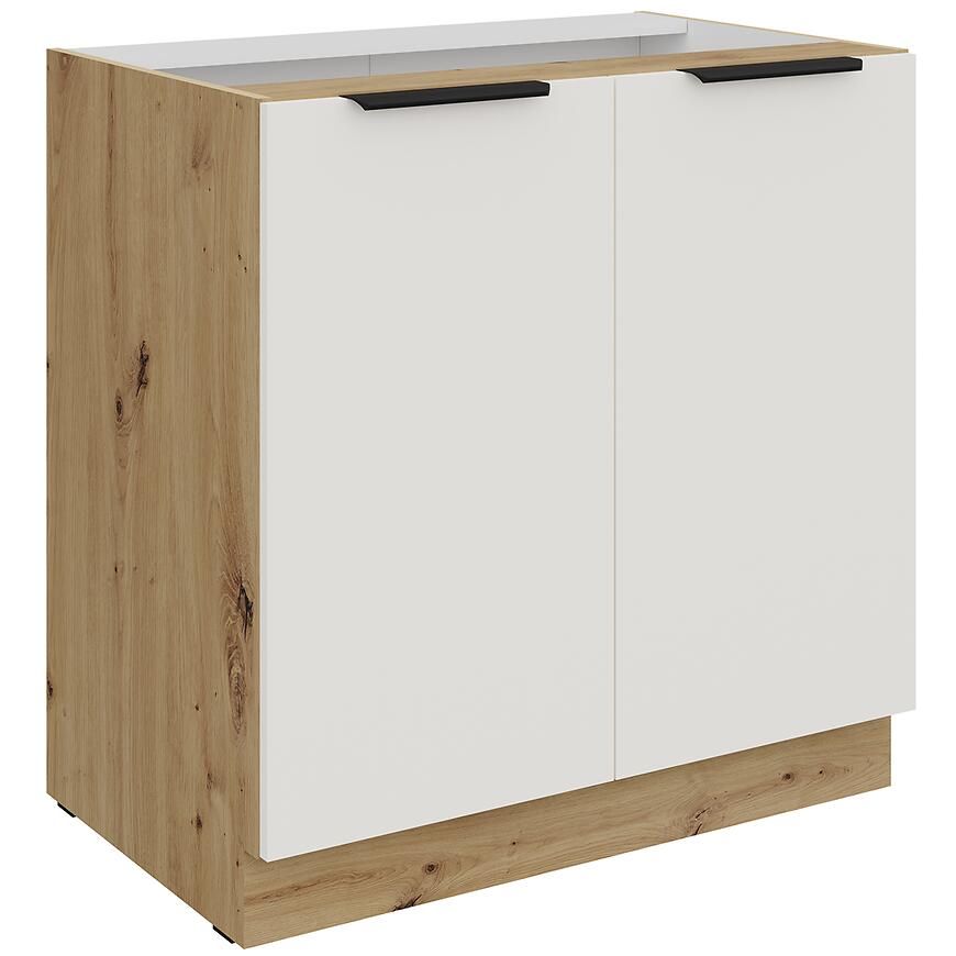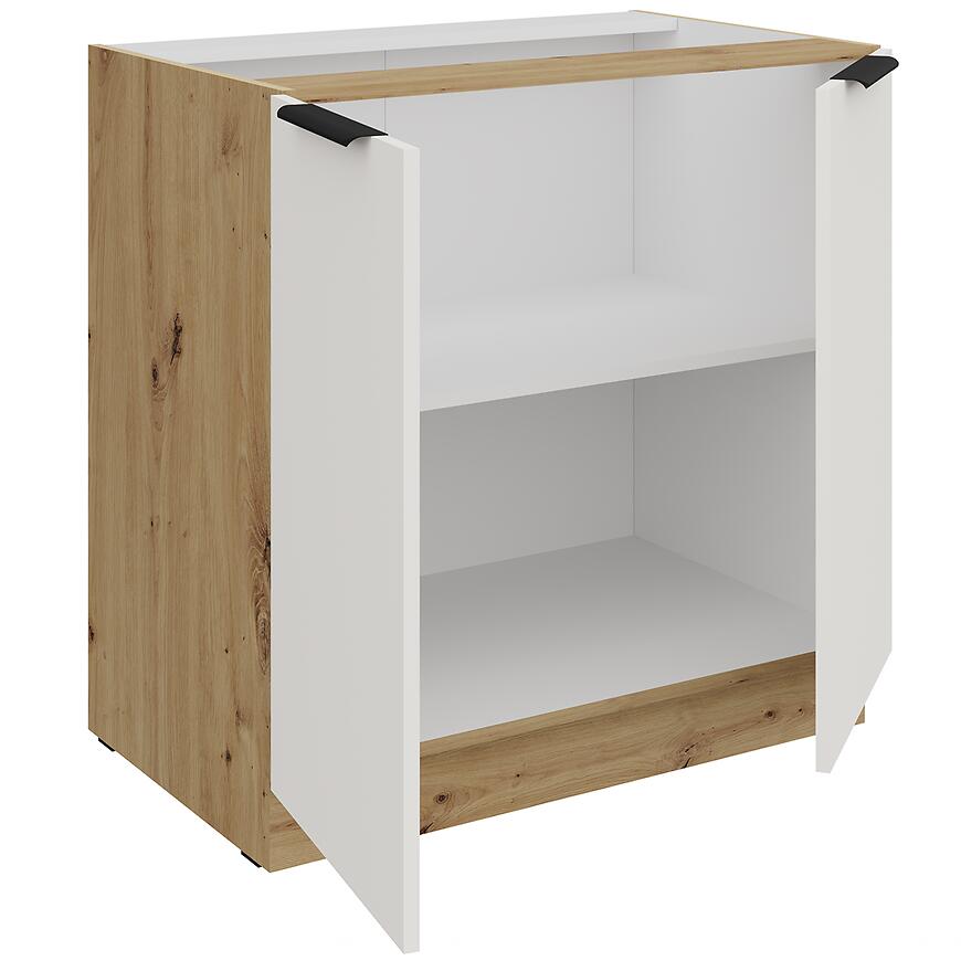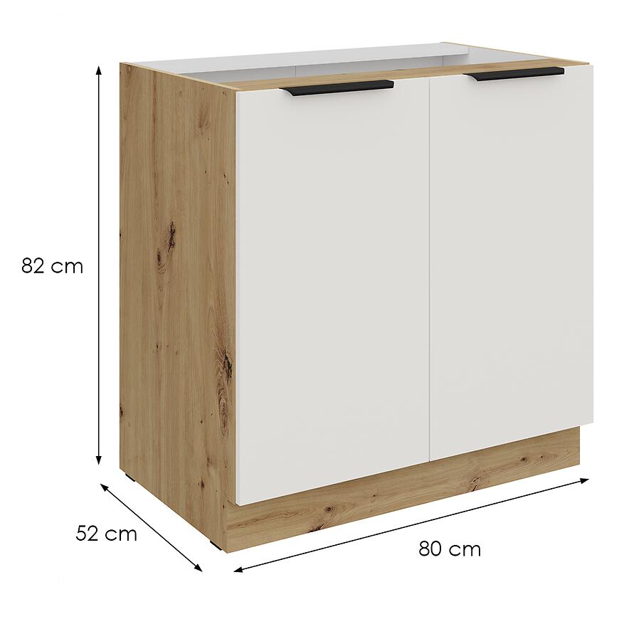 Szafka kuchenna Aria-Wh/Ar Anti Fingerprint 80d 2f Bb to nowoczesna szafka dolna o wymiarach 82 × 80 × 52 cm, łącząca estetykę z funkcjonalnością. Fronty w kolorze crystal white wykonano z laminowanej płyty wiórowej z matowym wykończeniem, co zapewnia odporność na odciski palców i łatwość utrzymania w czystości.