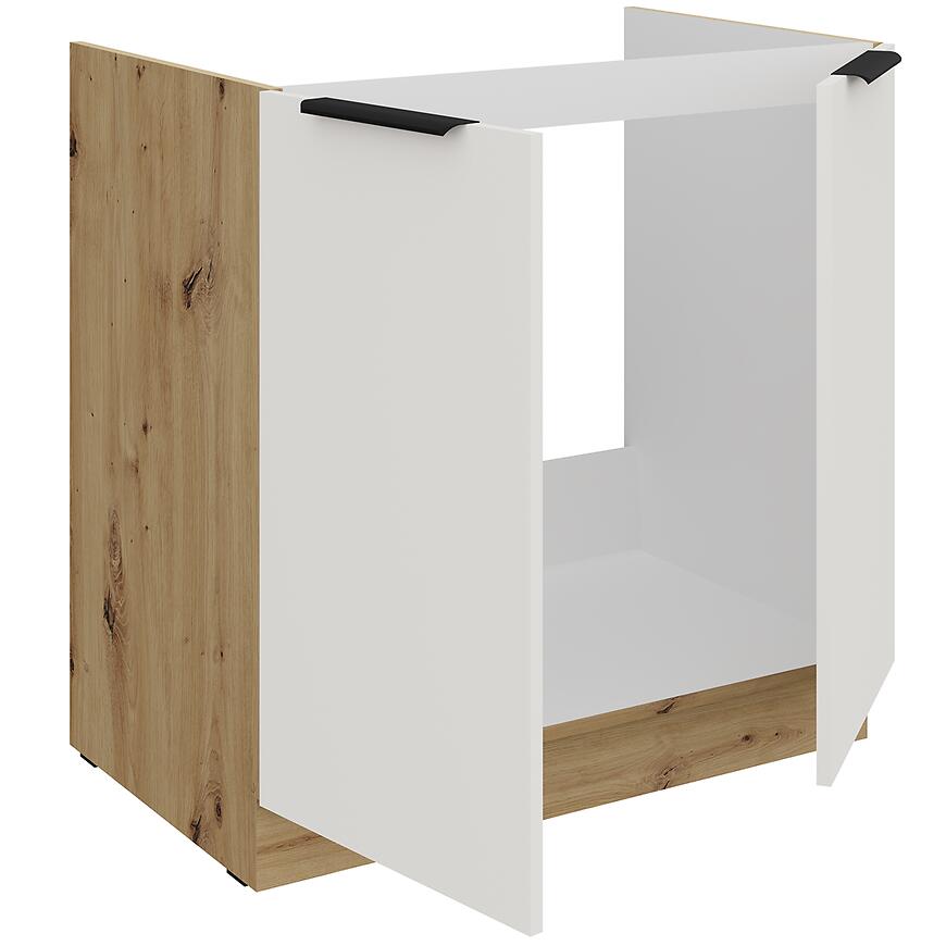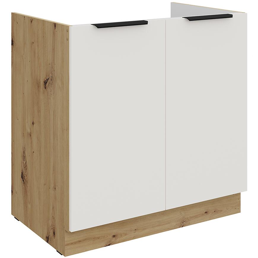 Szafka kuchenna Aria-Wh/Ar Anti Fingerprint 80zl 2f Bb to praktyczne, estetyczne i nowoczesne rozwiązanie, które łączy elegancję białego frontu z ciepłym drewnopodobnym korpusem, tworząc spójną aranżację kuchenną.