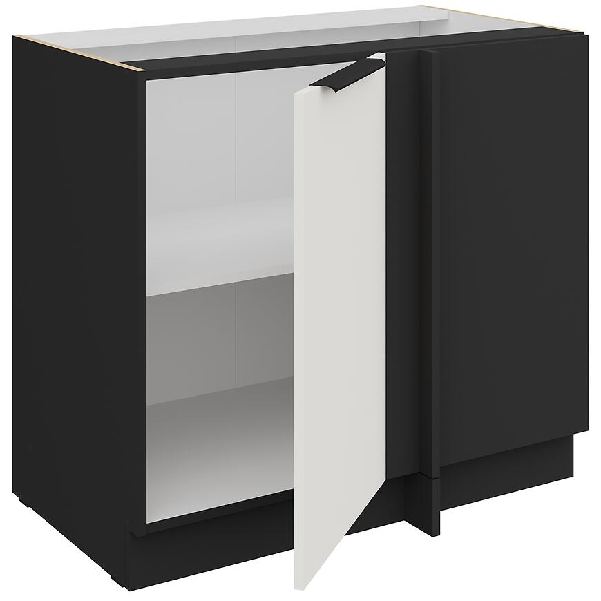Korpus szafki został wykonany z płyty wiórowej laminowanej w kolorze czarnym, co tworzy efektowny kontrast z białymi frontami. Matowe wykończenie korpusu podkreśla subtelność całej konstrukcji, a cokół w kolorze korpusu zapewnia spójną i harmonijną kompozycję. Szafka doskonale prezentuje się zarówno w pojedynkę, jak i jako element zestawu mebli kuchennych w stylu modern, industrialnym czy minimalistycznym.