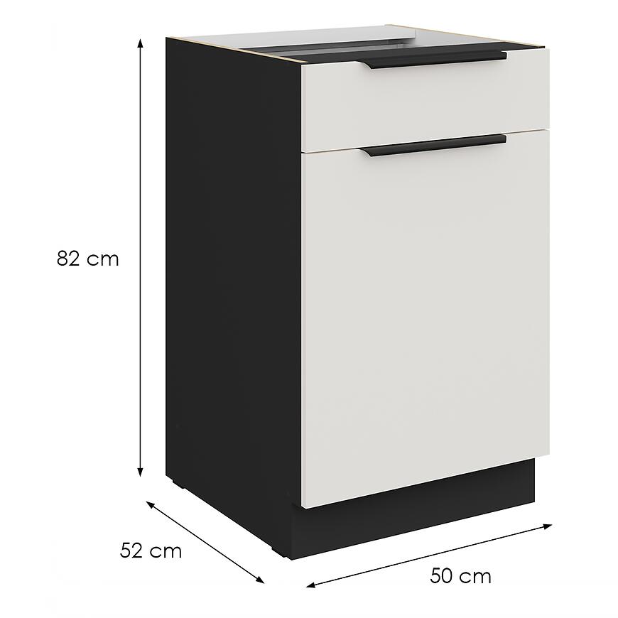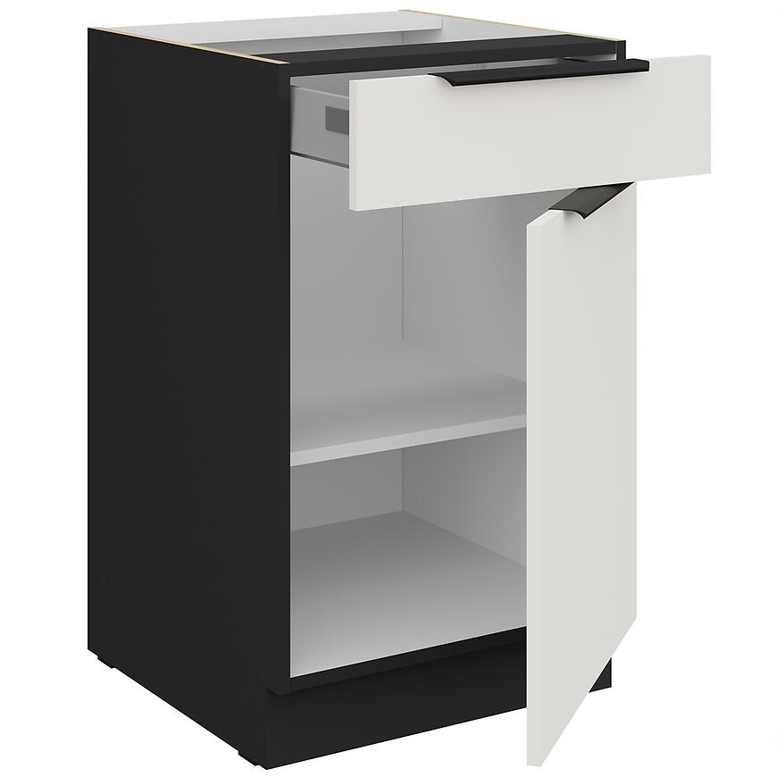 Korpus szafki został wykonany z płyty wiórowej laminowanej w kolorze czarnym, co tworzy efektowny kontrast z białymi frontami. Matowe wykończenie korpusu podkreśla subtelność całej konstrukcji, a cokół w kolorze korpusu zapewnia spójną i harmonijną kompozycję. Szafka doskonale prezentuje się zarówno w pojedynkę, jak i jako element zestawu mebli kuchennych w stylu modern, industrialnym czy minimalistycznym.
