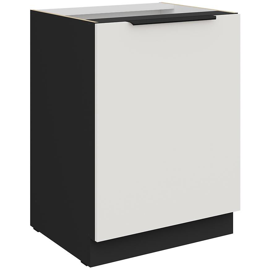 Korpus szafki został wykonany z płyty wiórowej laminowanej w kolorze czarnym, co tworzy efektowny kontrast z białymi frontami. Matowe wykończenie korpusu podkreśla subtelność całej konstrukcji, a cokół w kolorze korpusu zapewnia spójną i harmonijną kompozycję. Szafka doskonale prezentuje się zarówno w pojedynkę, jak i jako element zestawu mebli kuchennych w stylu modern, industrialnym czy minimalistycznym.