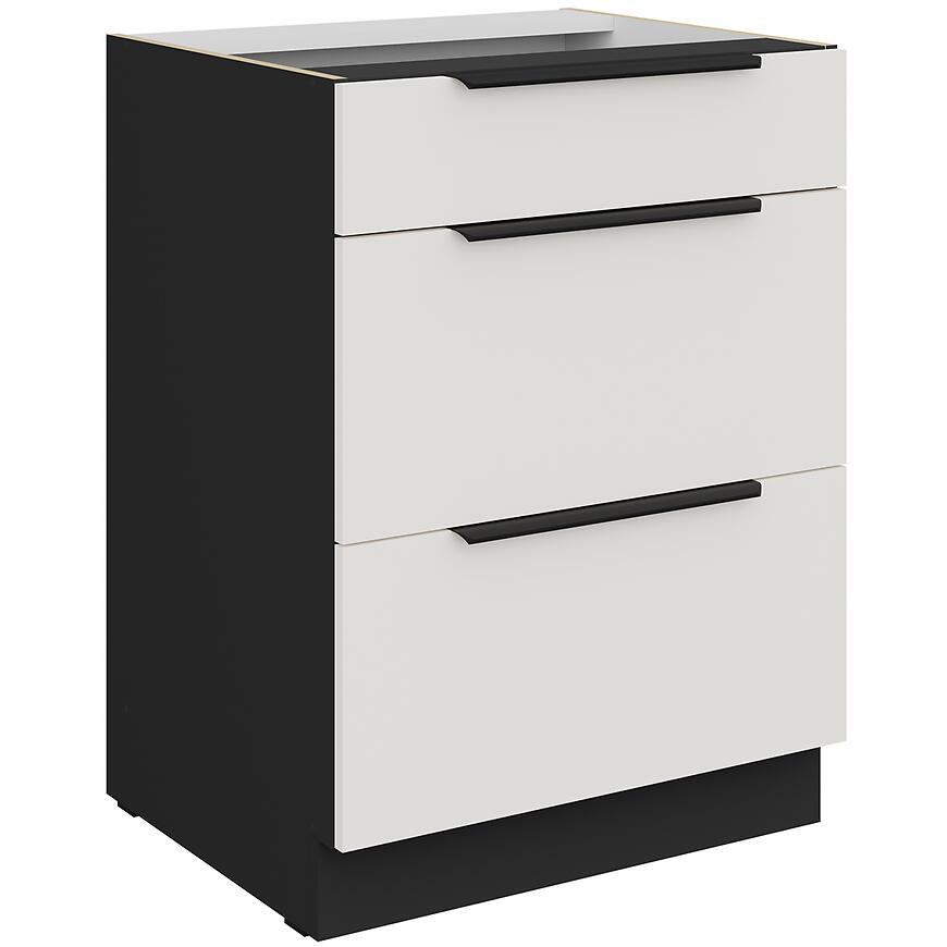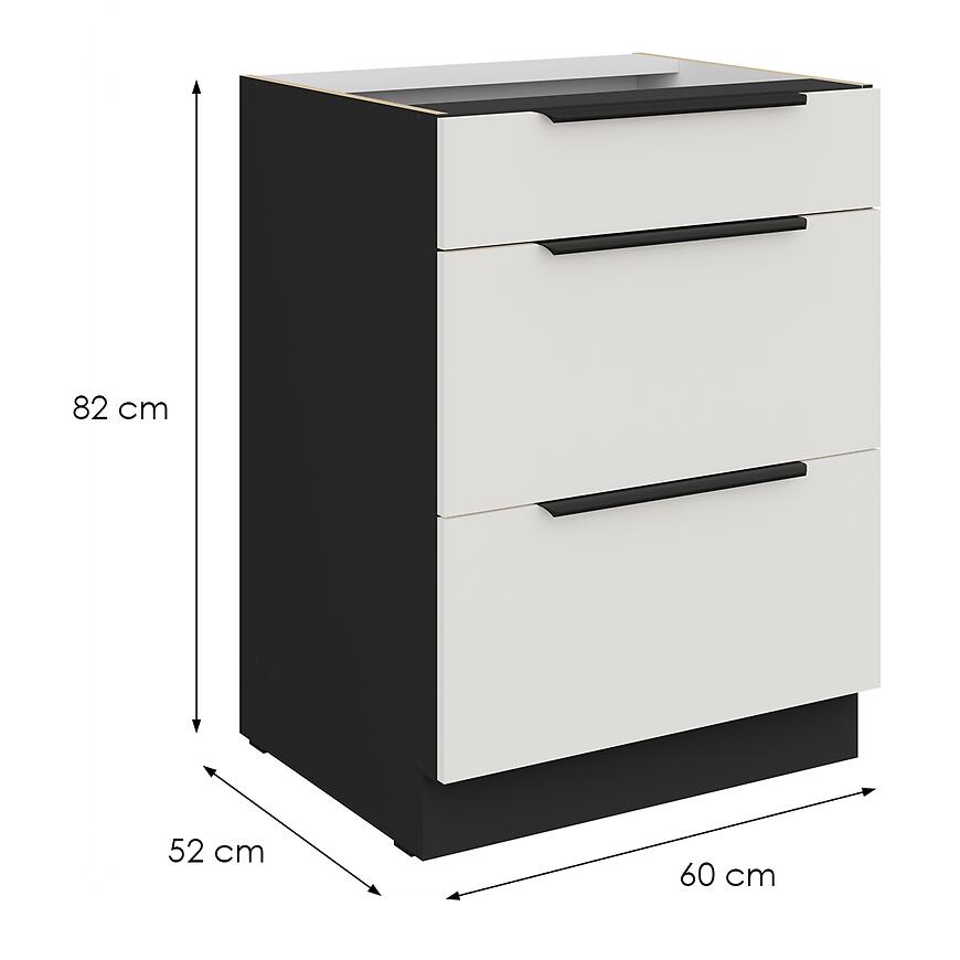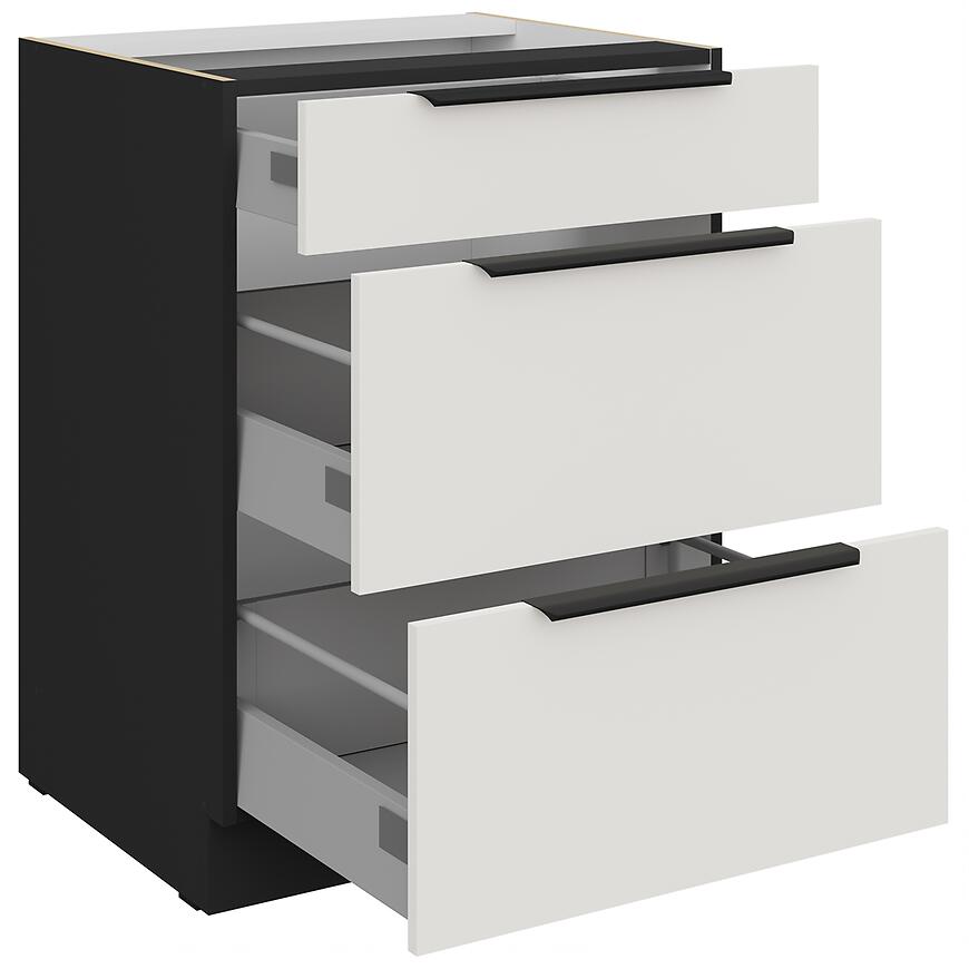 Korpus szafki został wykonany z płyty wiórowej laminowanej w kolorze czarnym, co tworzy efektowny kontrast z białymi frontami. Matowe wykończenie korpusu podkreśla subtelność całej konstrukcji, a cokół w kolorze korpusu zapewnia spójną i harmonijną kompozycję. Szafka doskonale prezentuje się zarówno w pojedynkę, jak i jako element zestawu mebli kuchennych w stylu modern, industrialnym czy minimalistycznym.