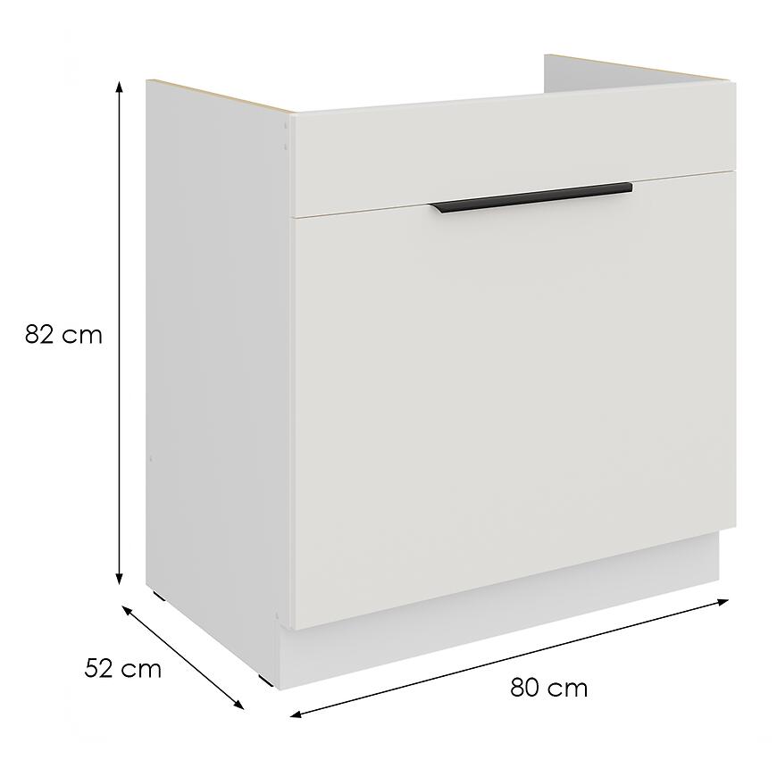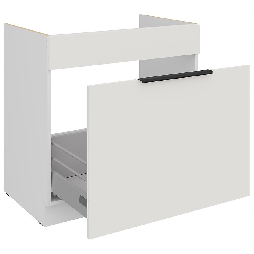 Szafka jest częścią dolnych szafek kuchennych, co pozwala na łatwe dopasowanie do innych elementów kuchni. Korpus w białym macie z laminowanej płyty wiórowej zapewnia trwałość i odporność na codzienne użytkowanie. Dzięki cichemu domykowi w zestawie, szafka zamyka się delikatnie i bezgłośnie, co zwiększa komfort korzystania i nadaje kuchni elegancki charakter.