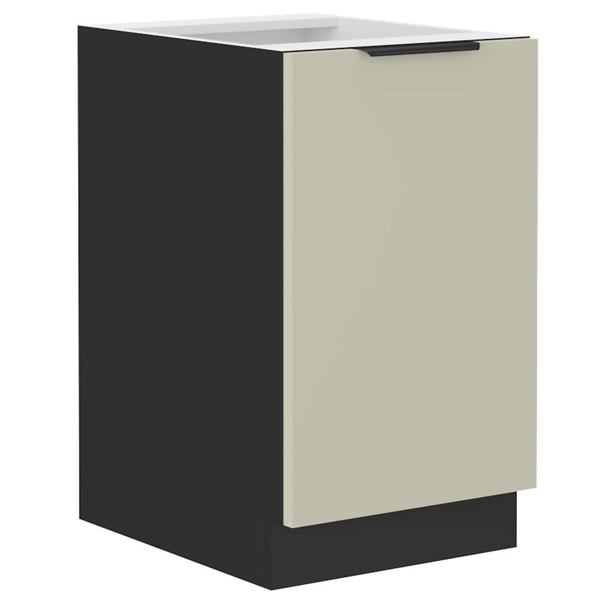 Czarne wybarwienie korpusu oraz beżowe wybarwienie frontów dolnych tworzą harmonijne połączenie, nadając wnętrzu kuchni nowoczesny i elegancki wygląd. Cokół w kolorze korpusu dodaje wyrafinowania, jednocześnie chroniąc mebel przed zabrudzeniami i kurzem.