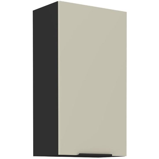 Fronty szafki utrzymane są w eleganckim, matowym wykończeniu, wykonane z płyty wiórowej laminowanej, co gwarantuje trwałość i łatwość w utrzymaniu czystości. Konstrukcja frontów zapewnia nie tylko estetykę, ale także solidność i stabilność mebla. Natomiast czarny korpus nadaje całości nowoczesnego charakteru, dodając wyrazistego kontrastu do delikatnego odcienia cashmere.