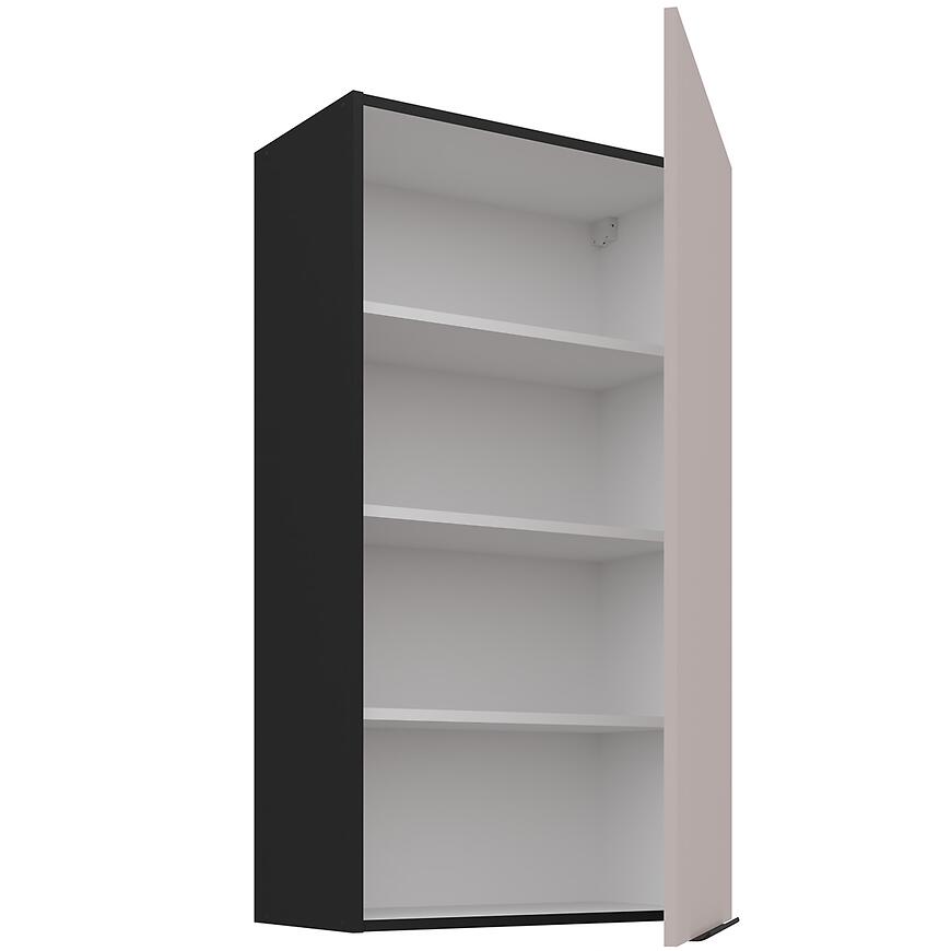 Front w kolorze cashmere, utrzymany w subtelnej beżowej tonacji, wprowadza do wnętrza ciepło i elegancję. Matowe wykończenie frontu nadaje szafce nowoczesny charakter i ułatwia utrzymanie jej estetycznego wyglądu na co dzień. Czarny korpus w matowym wykończeniu tworzy wyraźny kontrast z jasnym frontem, podkreślając stylowy design mebla i umożliwiając jego łatwe dopasowanie do pozostałych elementów kuchni.