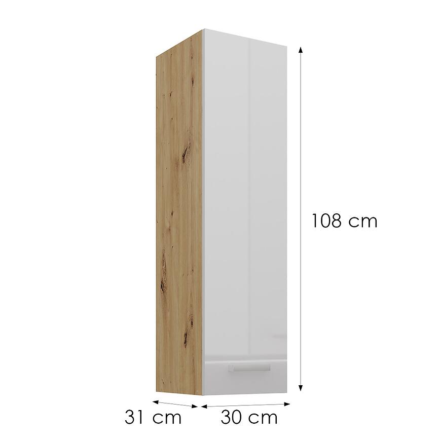 Wymiary szafki – 30 cm szerokości, 108 cm wysokości i 31 cm głębokości – pozwalają na funkcjonalne zagospodarowanie przestrzeni nad blatem roboczym. Model jest idealny do mniejszych kuchni lub jako uzupełnienie większych ciągów zabudowy.