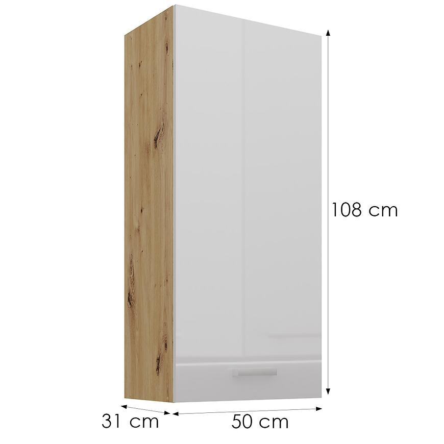Wymiary szafki – 50 cm szerokości, 108 cm wysokości i 31 cm głębokości – umożliwiają efektywne zagospodarowanie przestrzeni nad blatem roboczym. Model sprawdzi się w kuchniach o różnym układzie, zapewniając wygodny dostęp do przechowywanych przedmiotów.