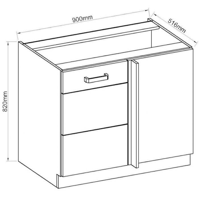 Model 90ND 1F BB posiada jedne drzwi, kryjące dużą przestrzeń do przechowywania naczyń, garnków i akcesoriów kuchennych. Szafka jest wyposażona w cokół w kolorze korpusu, który stabilizuje mebel i podkreśla jego estetykę.