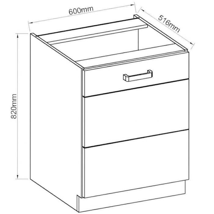 Cokół w kolorze korpusu nadaje szafce elegancki i spójny wygląd, a brak nóg podkreśla nowoczesny charakter mebla i pozwala uzyskać jednolitą linię zabudowy kuchennej. Brak osobnego blatu daje możliwość dopasowania go indywidualnie do aranżacji wnętrza.