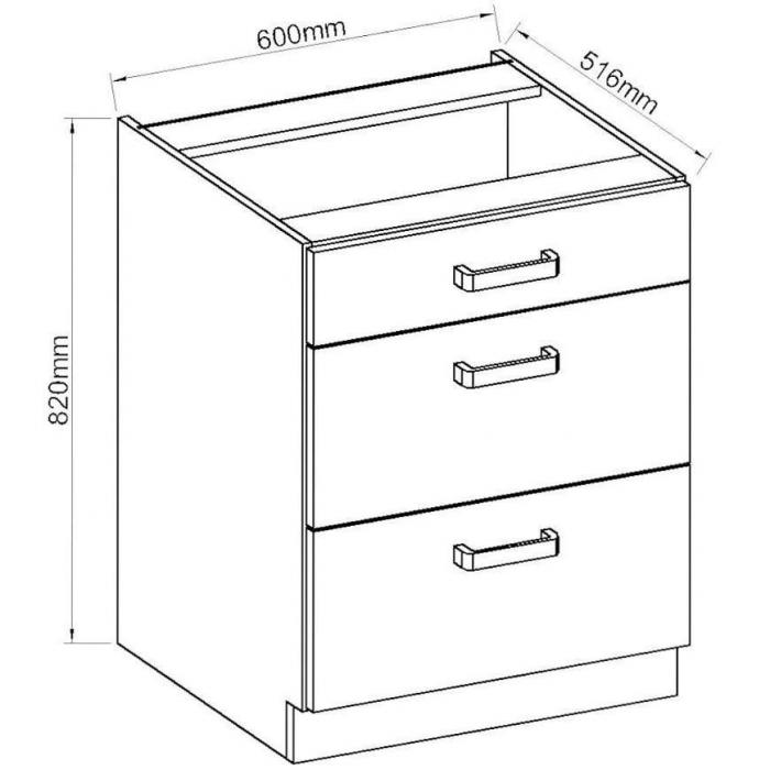 Model 60D 3S BB o szerokości 60 cm, wysokości 82 cm i głębokości 52 cm został zaprojektowany z myślą o wygodnym przechowywaniu naczyń, sztućców i akcesoriów kuchennych. Trzy pojemne szuflady umożliwiają uporządkowanie przestrzeni i szybki dostęp do zawartości.
