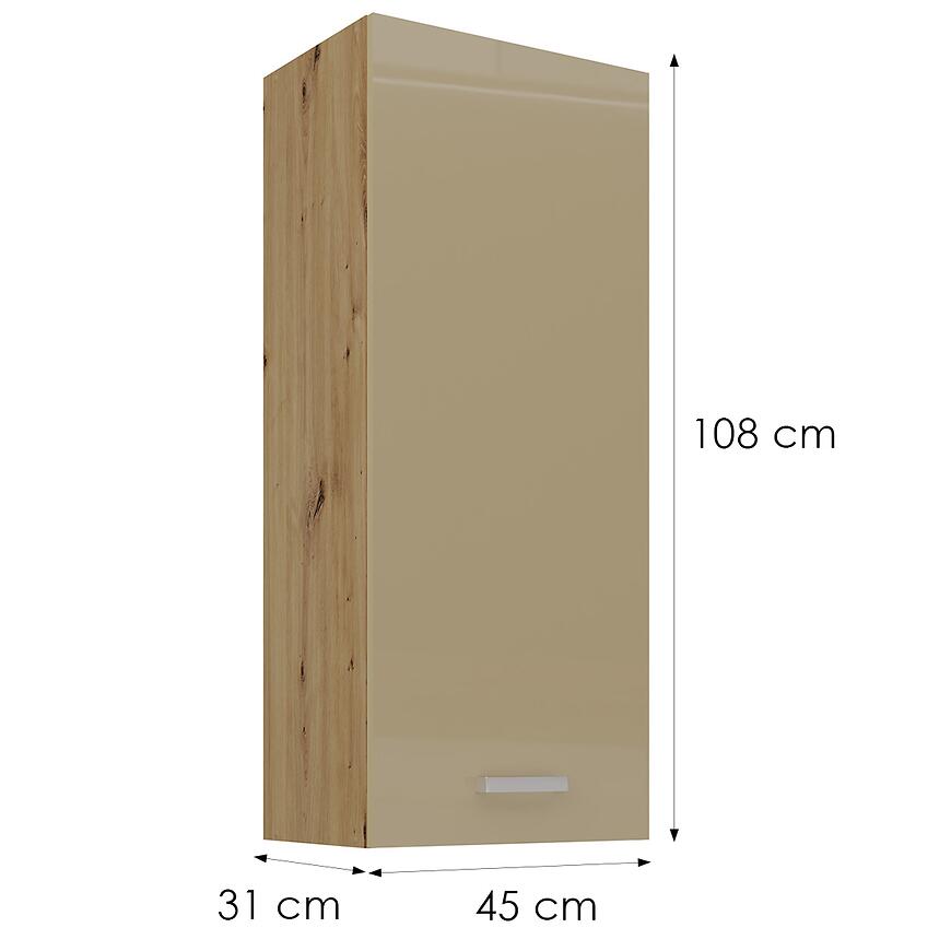 Wymiary szafki – 45 cm szerokości, 108 cm wysokości i 31 cm głębokości – umożliwiają optymalne wykorzystanie przestrzeni nad blatem. Model doskonale pasuje do kuchni o różnym układzie, zarówno mniejszych, jak i większych, gdzie istotna jest elegancka i spójna zabudowa.