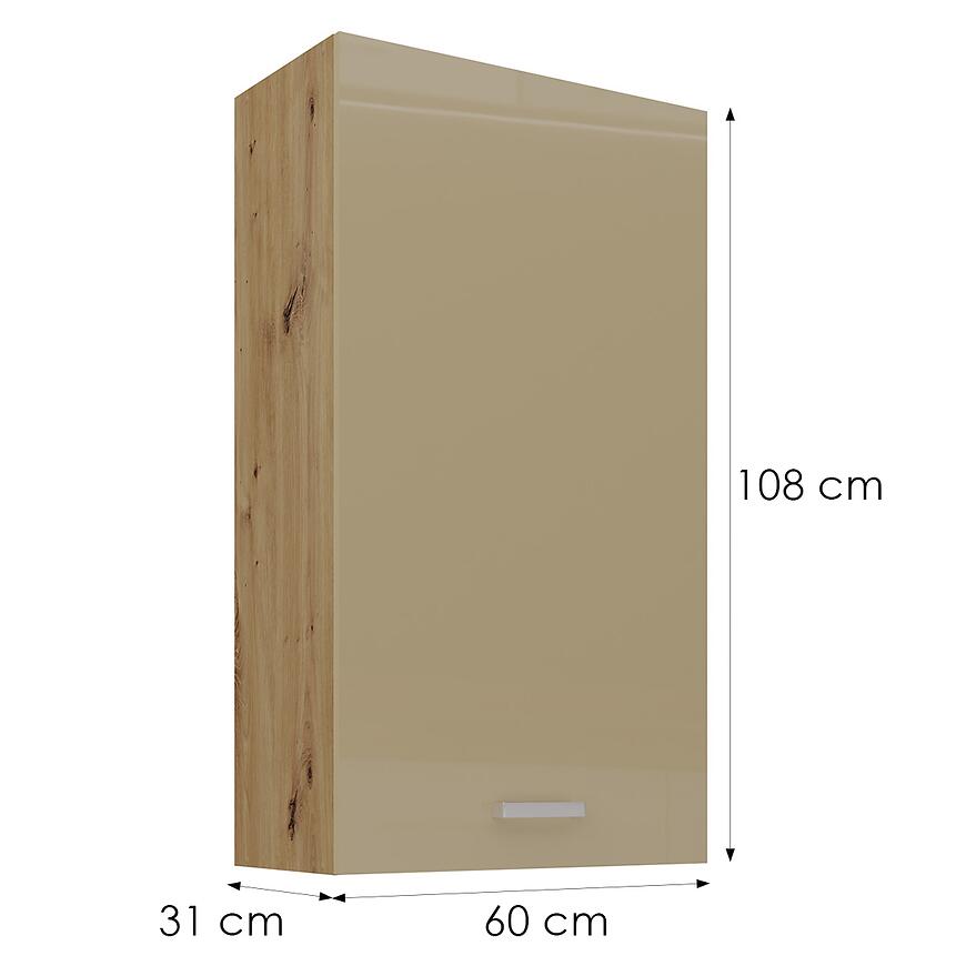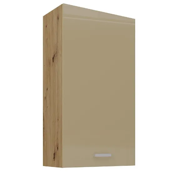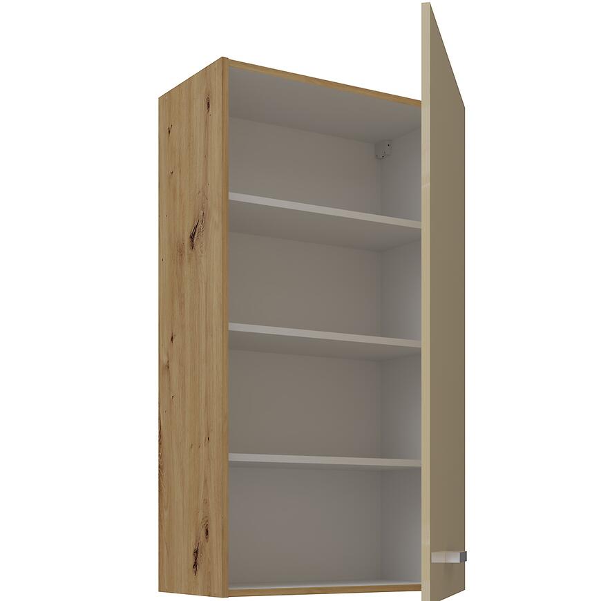 Szafka kuchenna Artisan cappucino 60G-108 1F to przestronny moduł górnej zabudowy kuchennej, który łączy elegancki wygląd z funkcjonalnym wykorzystaniem przestrzeni. Należy do kolekcji ARTISAN, wyróżniającej się jasnymi, drewnopodobnymi korpusami oraz frontami w połysku, nadającymi kuchni przytulny i nowoczesny charakter. Szafka o szerokości 60 cm sprawdzi się jako samodzielny moduł lub w zestawieniu z innymi szafkami kolekcji, tworząc spójną zabudowę górną.