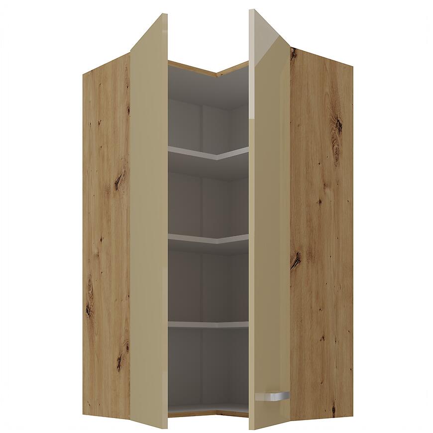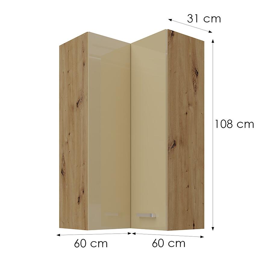 Szafka kuchenna Artisan cappucino 60x60 GN-108 2F (90°) to narożny moduł górnej zabudowy kuchennej z dwoma frontami, który łączy nowoczesny design z funkcjonalnym wykorzystaniem przestrzeni. Należy do kolekcji ARTISAN, wyróżniającej się jasnymi, drewnopodobnymi korpusami i frontami w połysku cappucino, nadającymi kuchni przytulny i elegancki charakter. Szafka narożna z frontami otwieranymi pod kątem 90° umożliwia wygodne korzystanie z narożników kuchni i maksymalne wykorzystanie dostępnej przestrzeni.