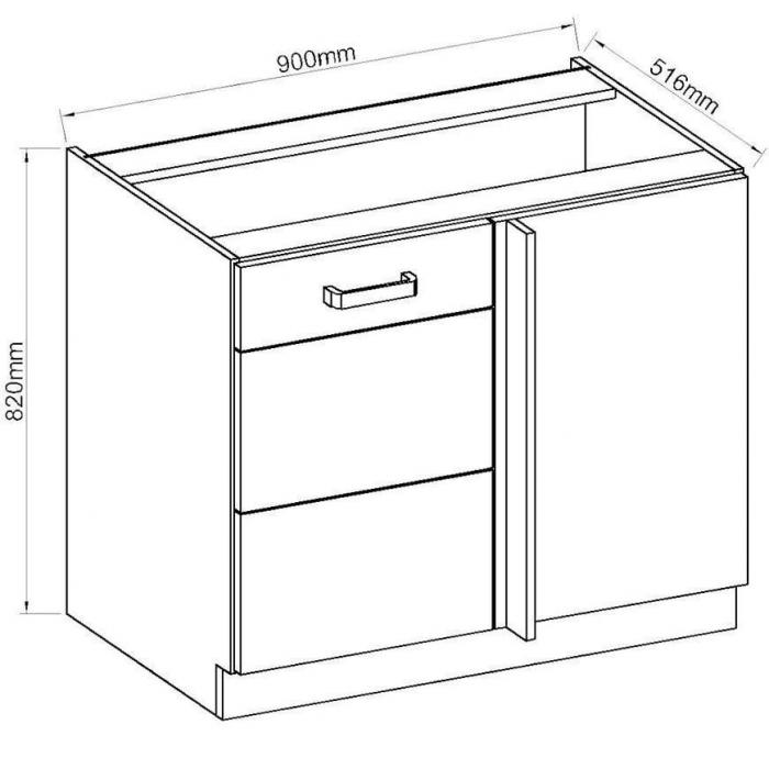 Model o szerokości 90 cm, głębokości 50 cm i wysokości 82 cm sprawdzi się jako funkcjonalna dolna szafka, idealna do przechowywania naczyń, garnków i innych akcesoriów kuchennych w jednej przestronnej komorze.