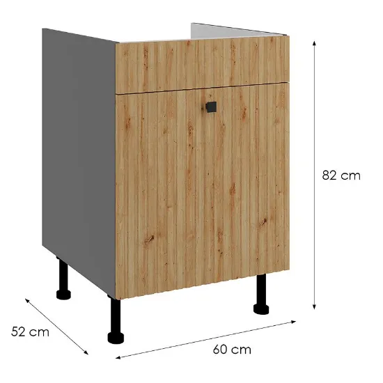 Szafka kuchenna Ava 60ZL 1S BB o wymiarach 60x52x82 cm to doskonałe rozwiązanie do mniejszych i średnich kuchni. Matowe fronty w odcieniu artisan w połączeniu z szarym korpusem antracyt tworzą stylową i elegancką kompozycję, która wpasuje się w każdy nowoczesny wystrój kuchni.