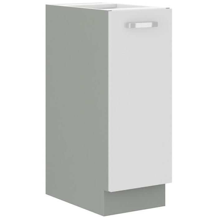 Fronty górne i dolne w kuchni są wykonane z płyty wiórowej laminowanej w kolorze biały połysk. Korpus to płyta laminowana w kolorze szarym.