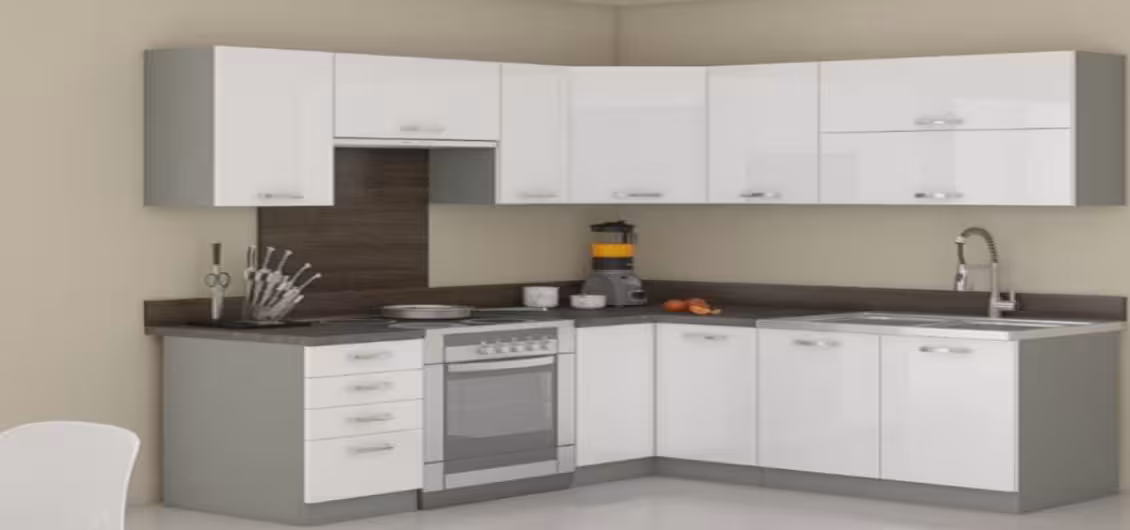 Zestaw mebli kuchennych BIANKA cechuje nowoczesny design i dobry gust. Stworzy wspaniałą kompozycję w nowoczesnym wnętrzu. Fronty górne i dolne w kuchni są wykonane z płyty wiórowej laminowanej w kolorze biały połysk. Korpus to płyta laminowana w kolorze szarym. Zastosowano metalowe uchwyty, które uzupełniają całość. Szafki posiadają system cichego domyku Indamatic, podobnie w szufladach zastosowano system cichego domyku.