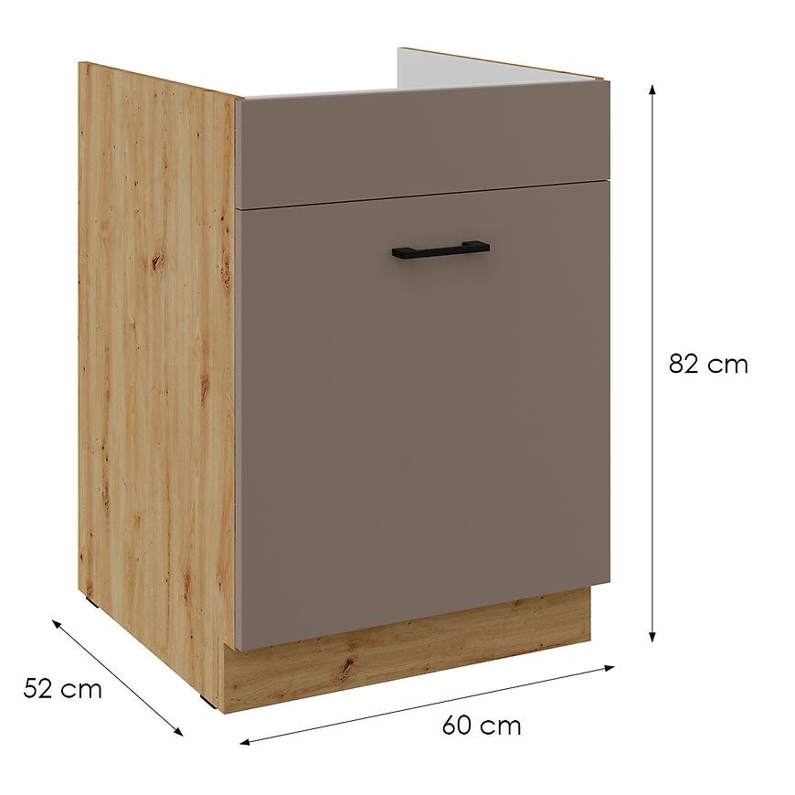 Szafka dolna Bolonia to połączenie elegancji, wytrzymałości i funkcjonalności. Matowe fronty w kolorze trufla, korpus artisan, cichy domyk oraz solidna konstrukcja czynią ją idealnym wyborem do nowoczesnej kuchni. Produkt przeznaczony pod zlew, o szerokości 60 cm, bez blatu w zestawie, wymaga samodzielnego montażu.