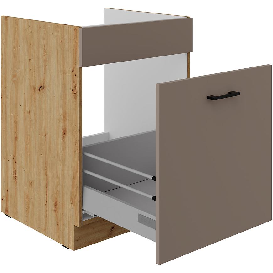 Szafka Bolonia 60ZL 1S BB zapewnia wygodną przestrzeń do przechowywania akcesoriów kuchennych. Matowe fronty w kolorze trufla w połączeniu z korpusem artisan tworzą elegancką i nowoczesną aranżację dolnej części kuchni.