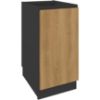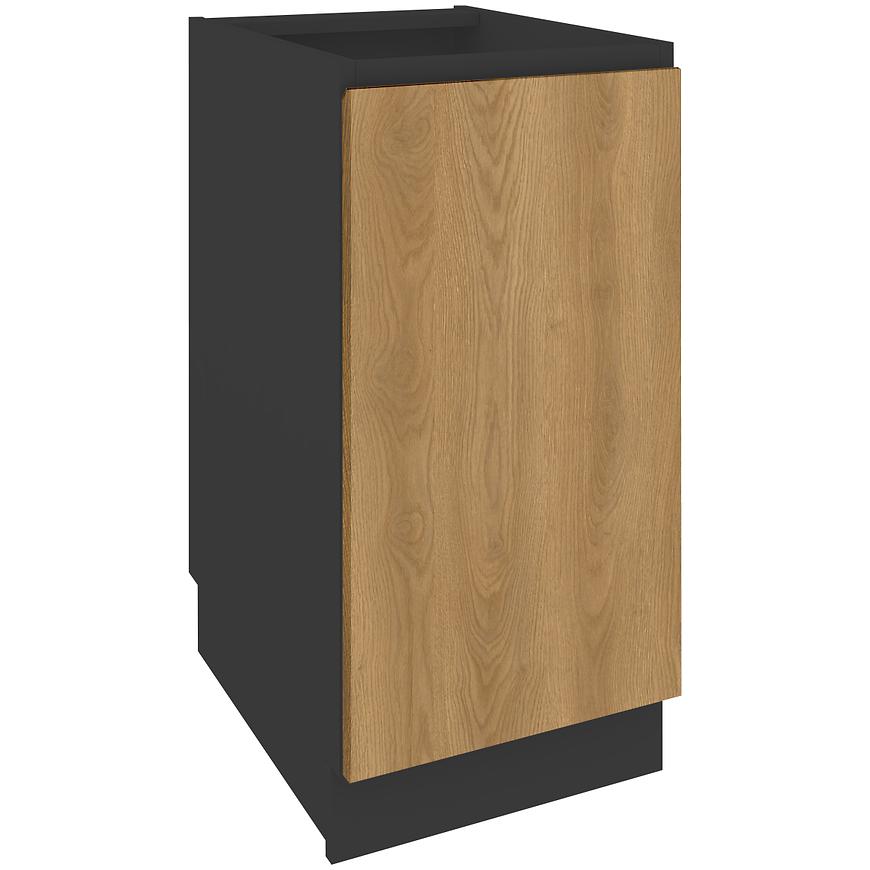 Szafka kuchenna Campari o wymiarach 82x40x54cm doskonale wpisze się w projekt kuchni, zapewniając przy tym optymalne wykorzystanie przestrzeni. Fronty w dębowym dekorze w odcieniu karmelu tworzą harmonijny kontrast z czarnym korpusem. Matowe wykończenie dodaje subtelności, podkreślając jednocześnie ich wysoką jakość. Cokół w kolorze korpusu gwarantuje spójny wygląd, jednocześnie chroniąc mebel przed kurzem i zabrudzeniami.