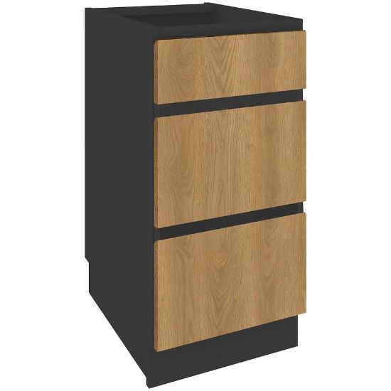Szafka kuchenna Campari o wymiarach 82x40x54cm doskonale wpisze się w projekt kuchni, zapewniając przy tym optymalne wykorzystanie przestrzeni. Fronty w dębowym dekorze w odcieniu karmelu tworzą harmonijny kontrast z czarnym korpusem. Matowe wykończenie dodaje subtelności, podkreślając jednocześnie ich wysoką jakość. Cokół w kolorze korpusu gwarantuje spójny wygląd, jednocześnie chroniąc mebel przed kurzem i zabrudzeniami.