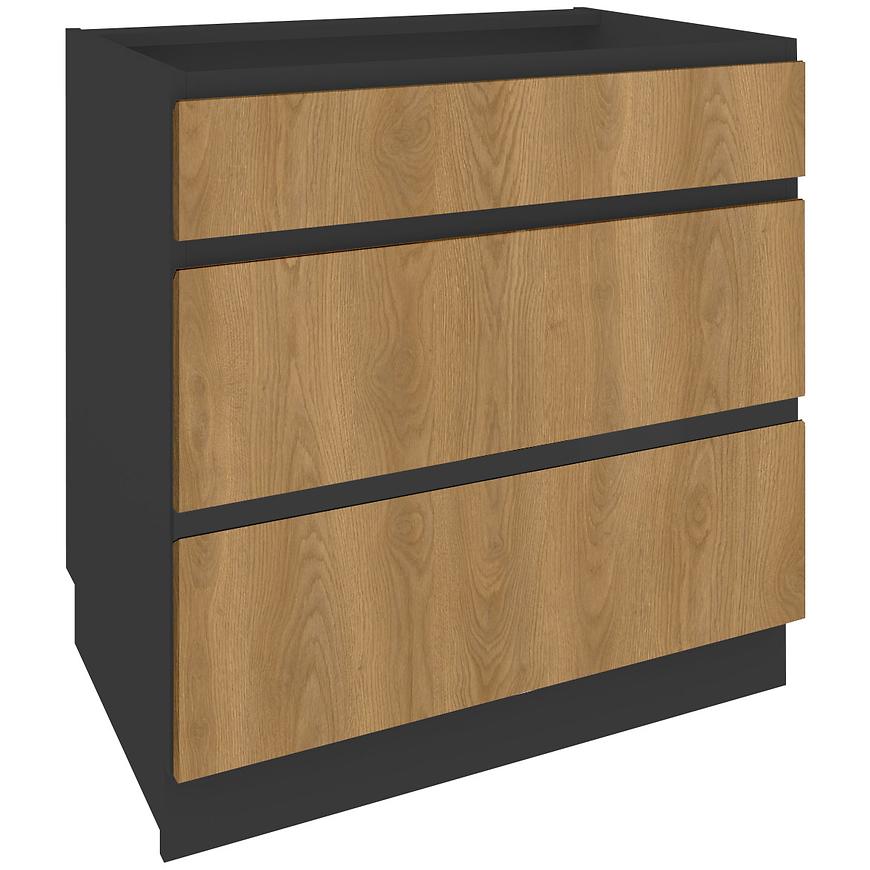 Szafka kuchenna Campari o wymiarach 82x80x54cm doskonale wpisze się w projekt kuchni, zapewniając przy tym optymalne wykorzystanie przestrzeni. Fronty w dębowym dekorze w odcieniu karmelu tworzą harmonijny kontrast z czarnym korpusem. Matowe wykończenie dodaje subtelności, podkreślając jednocześnie ich wysoką jakość. Cokół w kolorze korpusu gwarantuje spójny wygląd, jednocześnie chroniąc mebel przed kurzem i zabrudzeniami.