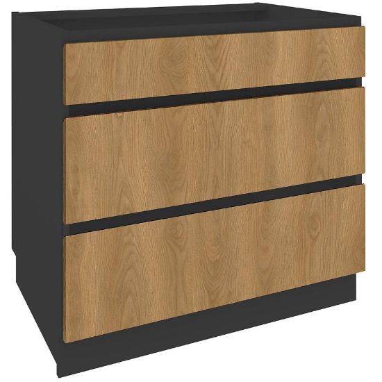 Szafka kuchenna Campari o wymiarach 82x90x54cm doskonale wpisze się w projekt kuchni, zapewniając przy tym optymalne wykorzystanie przestrzeni. Fronty w dębowym dekorze w odcieniu karmelu tworzą harmonijny kontrast z czarnym korpusem. Matowe wykończenie dodaje subtelności, podkreślając jednocześnie ich wysoką jakość. Cokół w kolorze korpusu gwarantuje spójny wygląd, jednocześnie chroniąc mebel przed kurzem i zabrudzeniami.