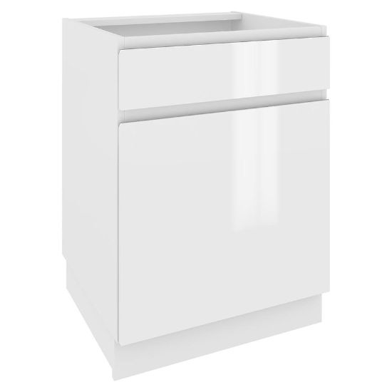 Biały korpus szafki pokryty jest matową powłoką, która stanowi doskonałe tło do połyskujących frontów. Konstrukcja korpusu opiera się na wytrzymałej płycie laminowanej, zapewniając trwałość i odporność na uszkodzenia.