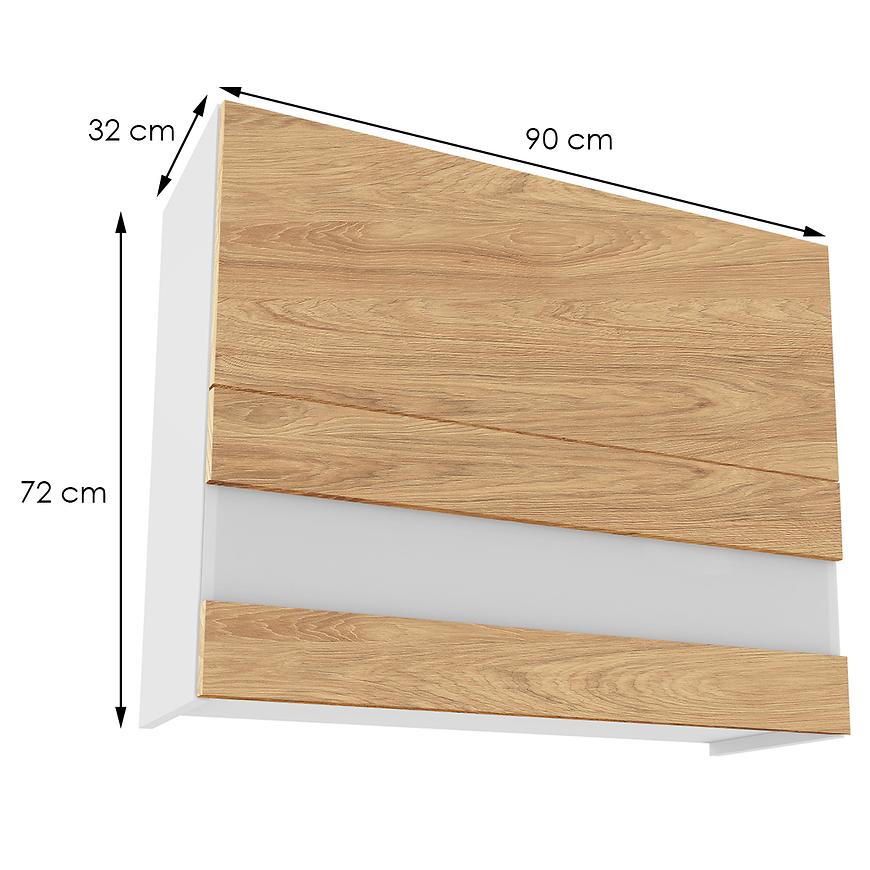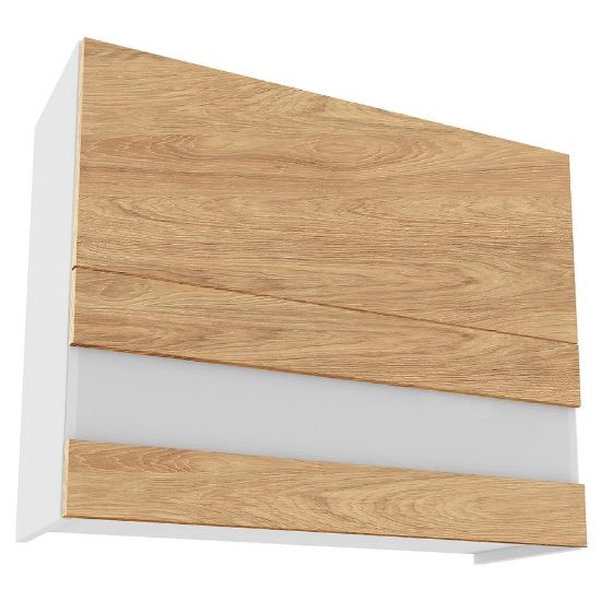 Elegancka szafka kuchenna wisząca z kolekcji Campari zachwyca swoim wyglądem i funkcjonalnością. Jej fronty w kolorze hikory prezentują się niezwykle stylowo, nadając kuchni wyjątkowego charakteru. Kontrastują one pięknie z białym kolorem korpusu, co dodaje pomieszczeniu lekkości i nowoczesnego wyrazu.