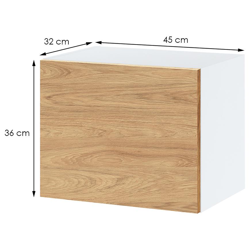 Elegancka szafka kuchenna wisząca z kolekcji Campari zachwyca swoim wyglądem i funkcjonalnością. Jej fronty w kolorze hikory prezentują się niezwykle stylowo, nadając kuchni wyjątkowego charakteru. Kontrastują one pięknie z białym kolorem korpusu, co dodaje pomieszczeniu lekkości i nowoczesnego wyrazu.