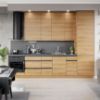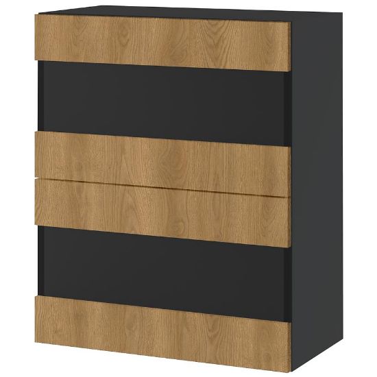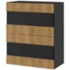 Dąb karmelowy, użyty do produkcji frontów, nadaje szafce niepowtarzalny charakter. To elegancki kolor, który doskonale współgra z wieloma aranżacjami wnętrz, dodając im ciepła i przytulności. Czarny korpus w matowym wykończeniu to idealne tło dla frontów, tworząc kontrastowy efekt i dodając nowoczesności.