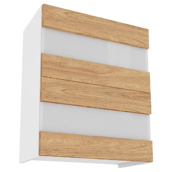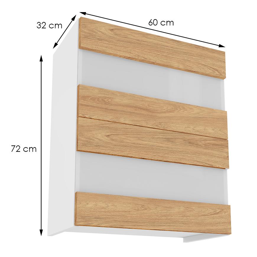 Elegancka szafka kuchenna wisząca z kolekcji Campari zachwyca swoim wyglądem i funkcjonalnością. Jej fronty w kolorze hikory prezentują się niezwykle stylowo, nadając kuchni wyjątkowego charakteru. Kontrastują one pięknie z białym kolorem korpusu, co dodaje pomieszczeniu lekkości i nowoczesnego wyrazu.